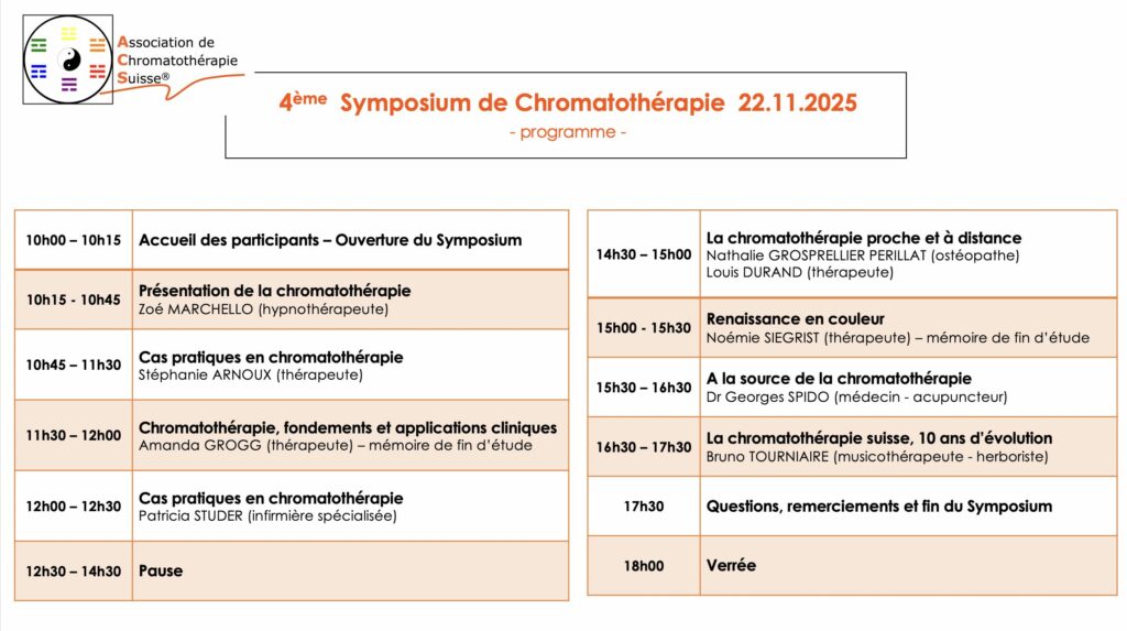 L’Association de Chromatothérapie Suisse® a le plaisir de vous convier à son 4ème Symposium de Chromatothérapie,