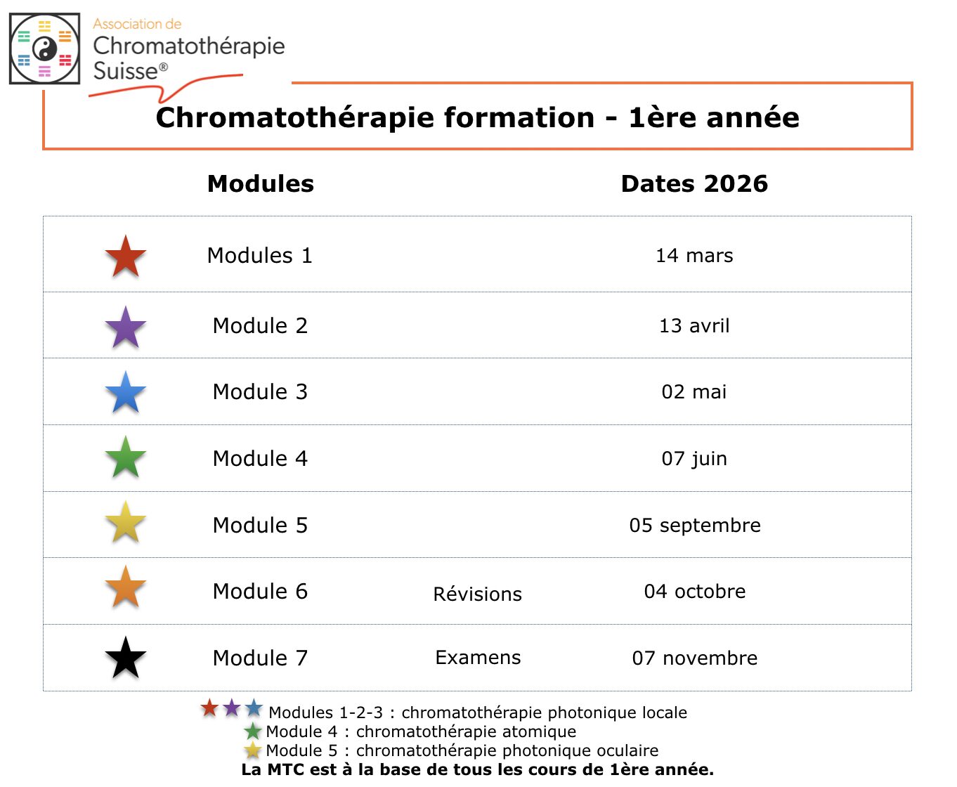 La première année prépare les élèves au langage énergétique / climatique des couleurs, langage universel, issu et connu de la médecine traditionnelle chinoise millénaire. L’apprentissage est centré sur la compréhension méthodique des pathologies, de leur décryptage énergétique en lien avec la MTC, médecine millénaire ; la pédagogie est adaptée à chacun. Une approche variée sera proposée aux étudiants, soit une présentation de toutes les possibilités de traitements en chromatothérapie, au niveau local, oculaire, utilisations externes et internes des oligo-éléments (vibrations électromagnétiques des atomes)…
