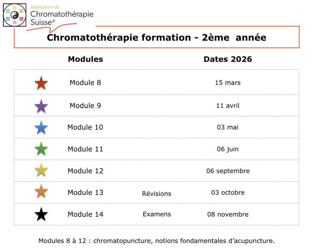 La deuxième année renforcera les connaissances des étudiants, la MTC sera au coeur de l’enseignement. La compréhension de l’énergétique sera plus développée, avec l’utilisation des points d’acupuncture, réutilisation des cycles horaires des méridiens (vu en 1ère année), traitements complexes de pathologies lourdes et des terrains énergétiques. Chaque étudiant est soutenu et suivi dans sa démarche d’apprentissage. Un mémoire de fin d’étude (après les examens finaux), permettra au futur chromatothérapeute d’exposer la pratique qu’il aura eue lors de sa formation.