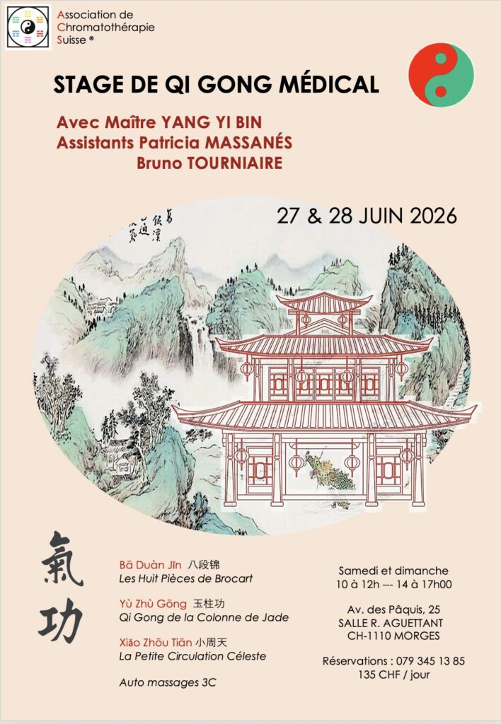 Pour la troisième année consécutive, l’École de Chromatothérapie Suisse organise un stage de Qi Gong médical destiné aux thérapeutes, praticiens en santé naturelle et à toute personne soucieuse d’entretenir, renforcer et harmoniser son Qi.